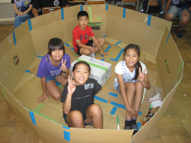 お腹いっぱいになり、帰りのバス内レクでは「なぞなぞクイズ」「手のひら伝言ゲーム」で盛り上がり、伝言の正確さに参加者の皆さんの結束を感じました。 富勢西小学校に着いて、班ごとに分かれ、段ボールハウスを作成しました。夢のマイホーム、コケッコハウス、ダンボール一軒家、K・A家(個人情報なのでイニシャルにしました)、5班の大きな家、ダンボールリラックスハウス。何のことだかお分かりでしょうか? 次のスライドショーをご覧ください。