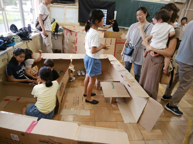 お腹いっぱいになり、帰りのバス内レクでは「なぞなぞクイズ」「手のひら伝言ゲーム」で盛り上がり、伝言の正確さに参加者の皆さんの結束を感じました。 富勢西小学校に着いて、班ごとに分かれ、段ボールハウスを作成しました。夢のマイホーム、コケッコハウス、ダンボール一軒家、K・A家(個人情報なのでイニシャルにしました)、5班の大きな家、ダンボールリラックスハウス。何のことだかお分かりでしょうか? 次のスライドショーをご覧ください。